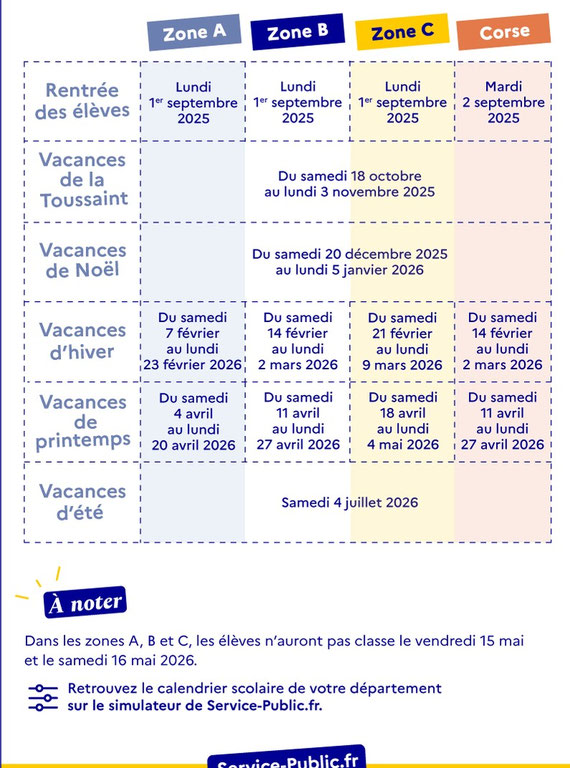 CALENDRIER VACANCES SCOLAIRES 2025-2026